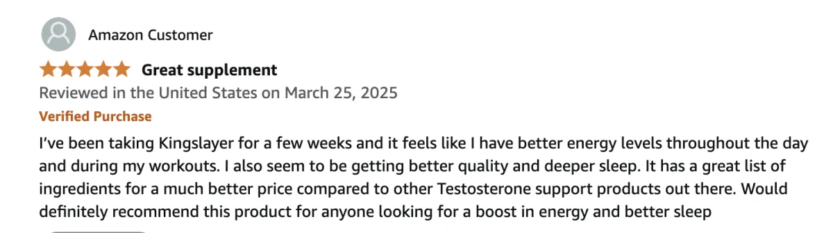 I’ve been taking Kingslayer for a few weeks and it feels like I have better energy levels throughout the day and during my workouts. I also seem to be getting better quality and deeper sleep. It has a great list of ingredients for a much better price compared to other Testosterone support products out there. Would definitely recommend this product for anyone looking for a boost in energy and better sleep