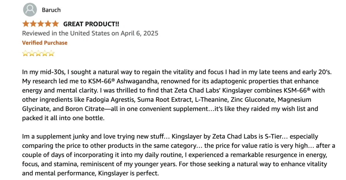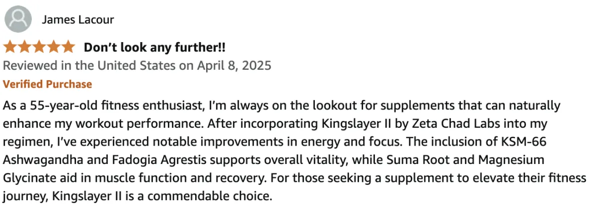 Im a supplement junky and love trying new stuff… Kingslayer by Zeta Chad Labs is S-Tier… especially comparing the price to other products in the same category… the price for value ratio is very high… after a couple of days of incorporating it into my daily routine, I experienced a remarkable resurgence in energy, focus, and stamina, reminiscent of my younger years. For those seeking a natural way to enhance vitality and mental performance, Kingslayer is perfect.