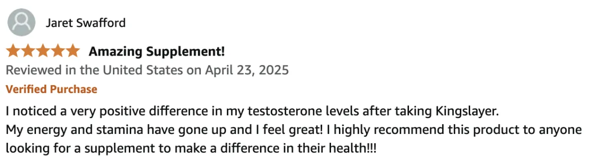 I noticed a very positive difference in my testosterone levels after taking Kingslayer. My energy and stamina have gone up and I feel great! I highly recommend this product to anyone looking for a supplement to make a difference in their health!!!
